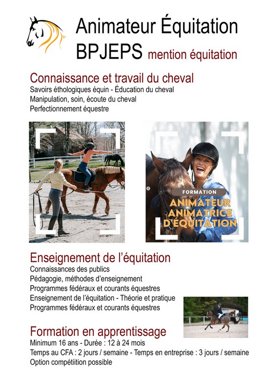 - 4h00 de pratique équestre, en entreprise ou CFA au choix, soit 12 % du temps