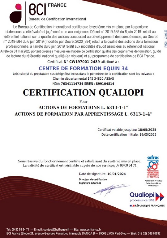 BPJEPS Activités équestres option A Initiation Poney / Cheval - Habilitation n° 24LMPHABBP40008 (version 2024)
